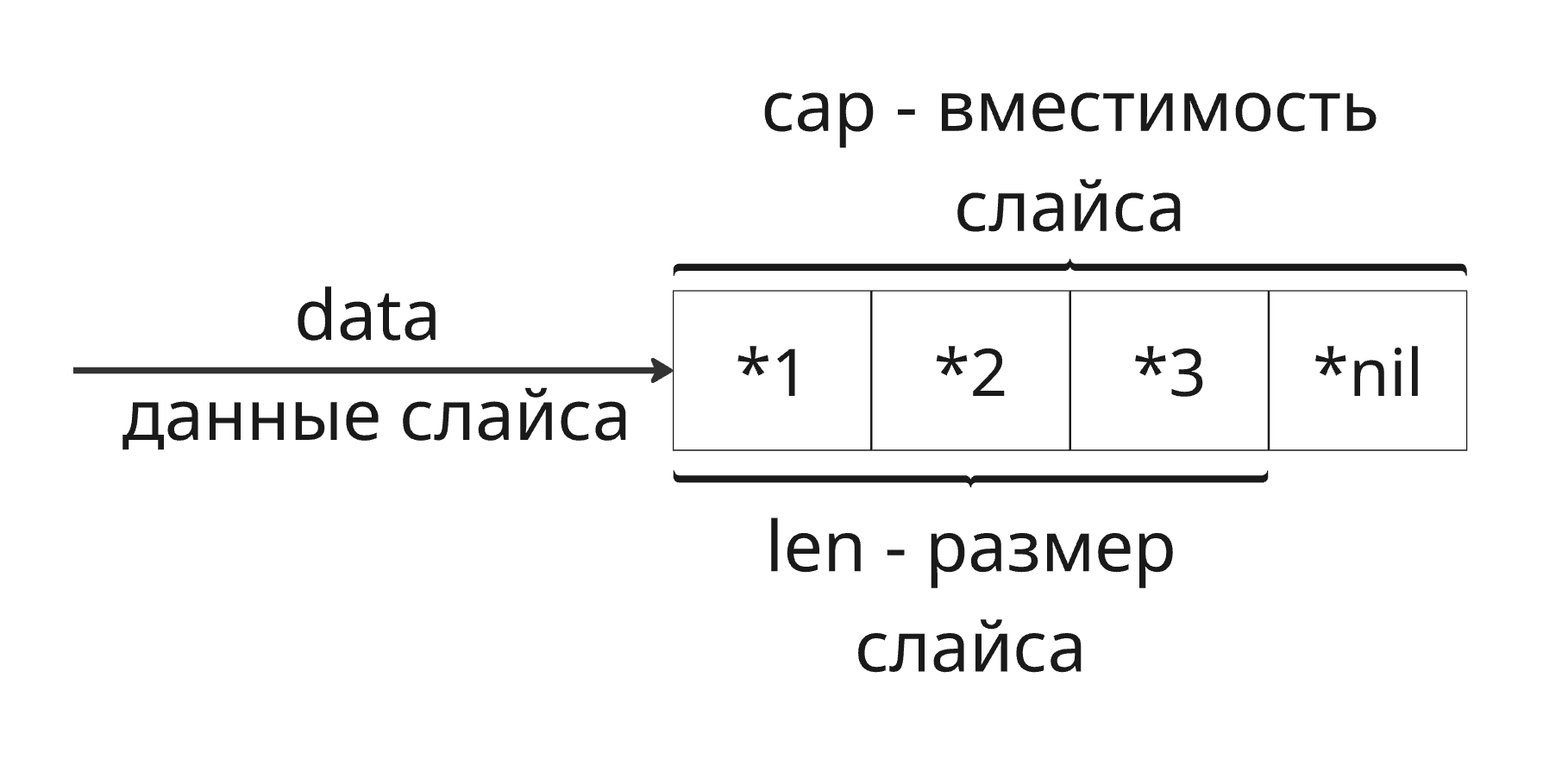 }Обратите внимание, что при такой инициализации слайса мы не можем влиять на вместимость слайса (cap), что важно для многих оптимизаций.
